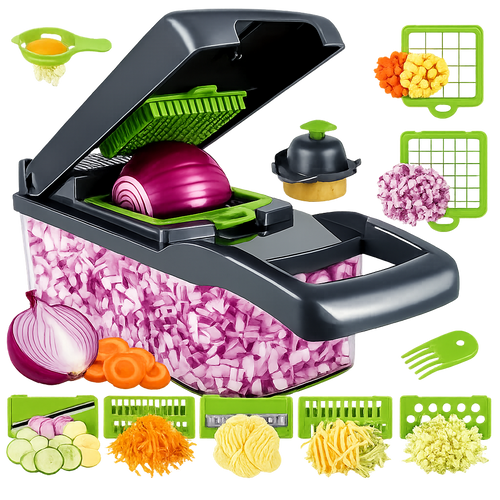 Coupe-légumes Multifonction 16-en-1 avec Boîte de Récupération Dés – Tranches – Julienne – Ondulé – Râpe – Hachage rapide